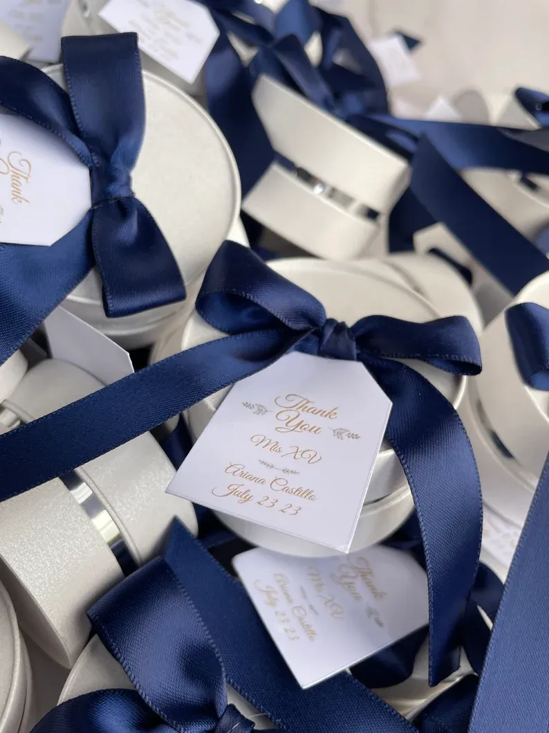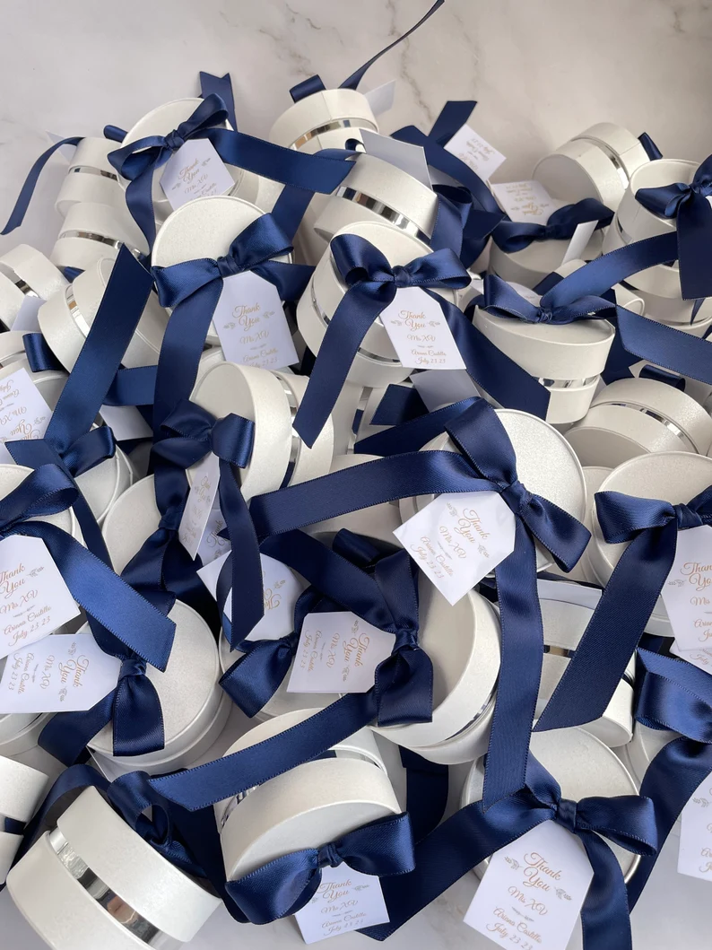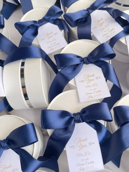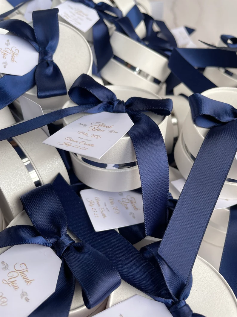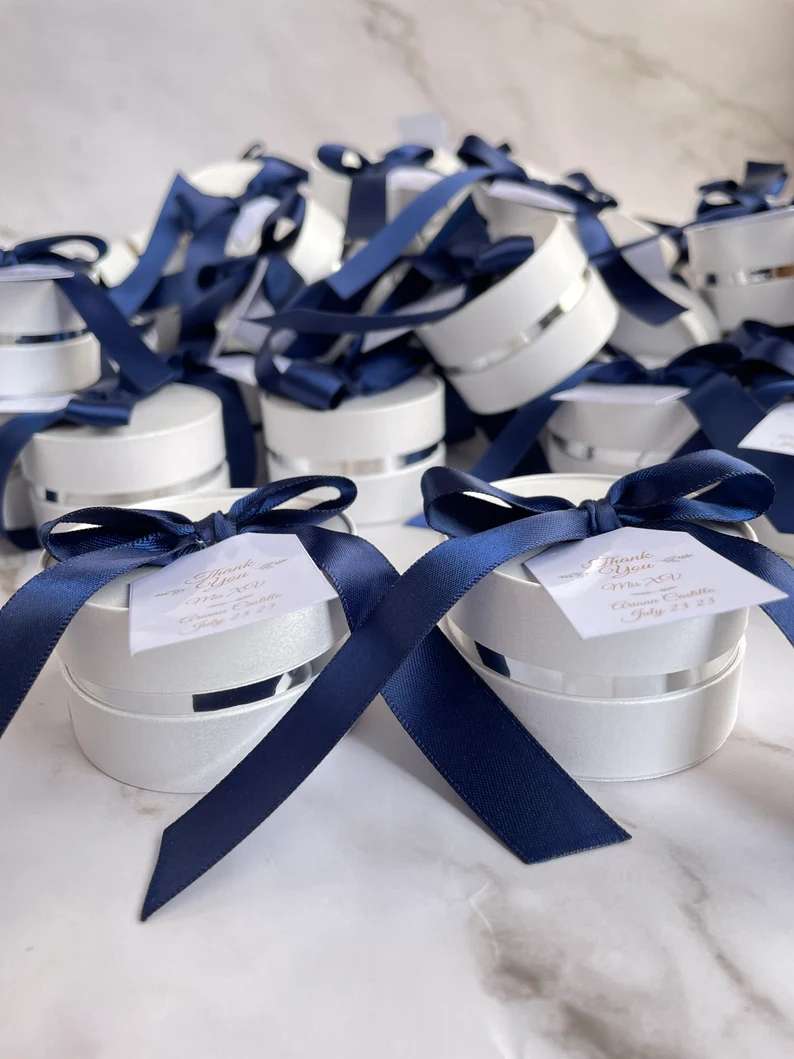 Box Diameter is 5,5 cm and the height is 3,5 cm, you can also choose any ribbon color, just contact me