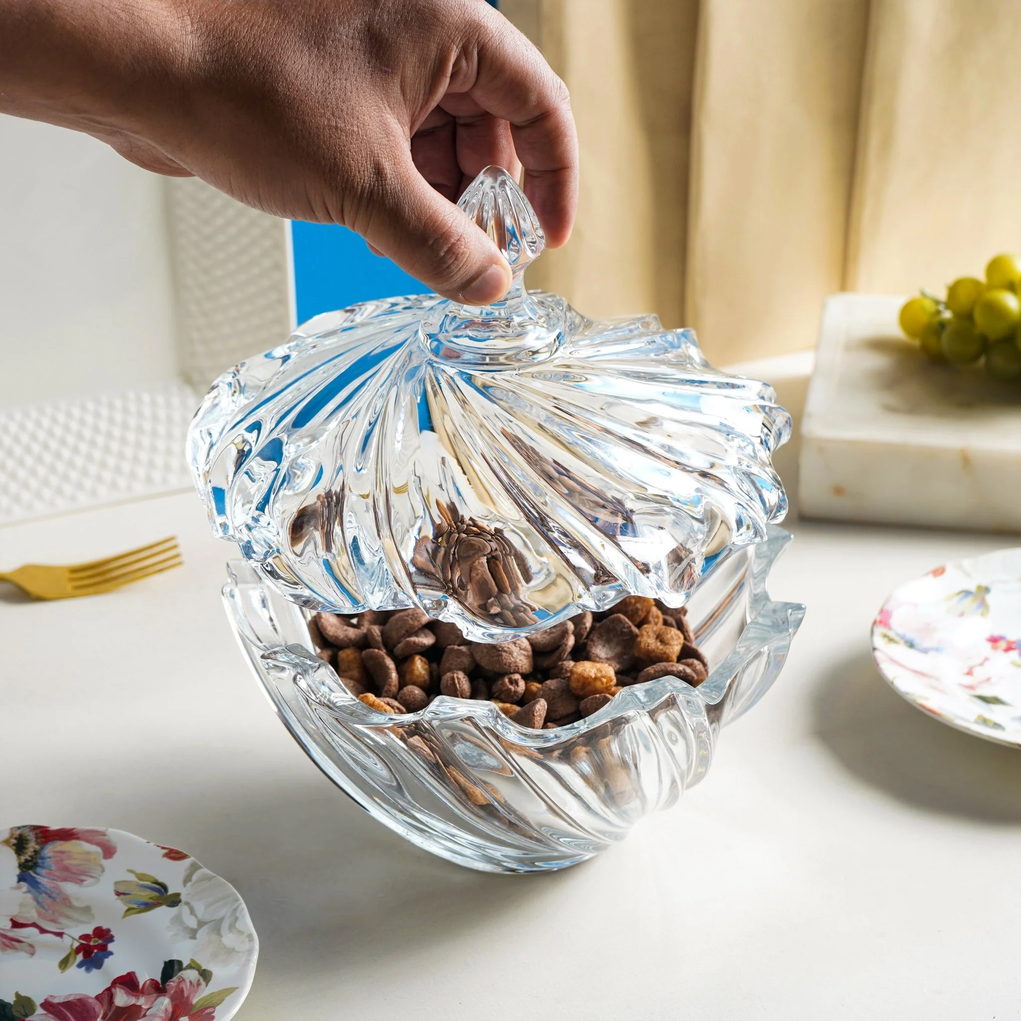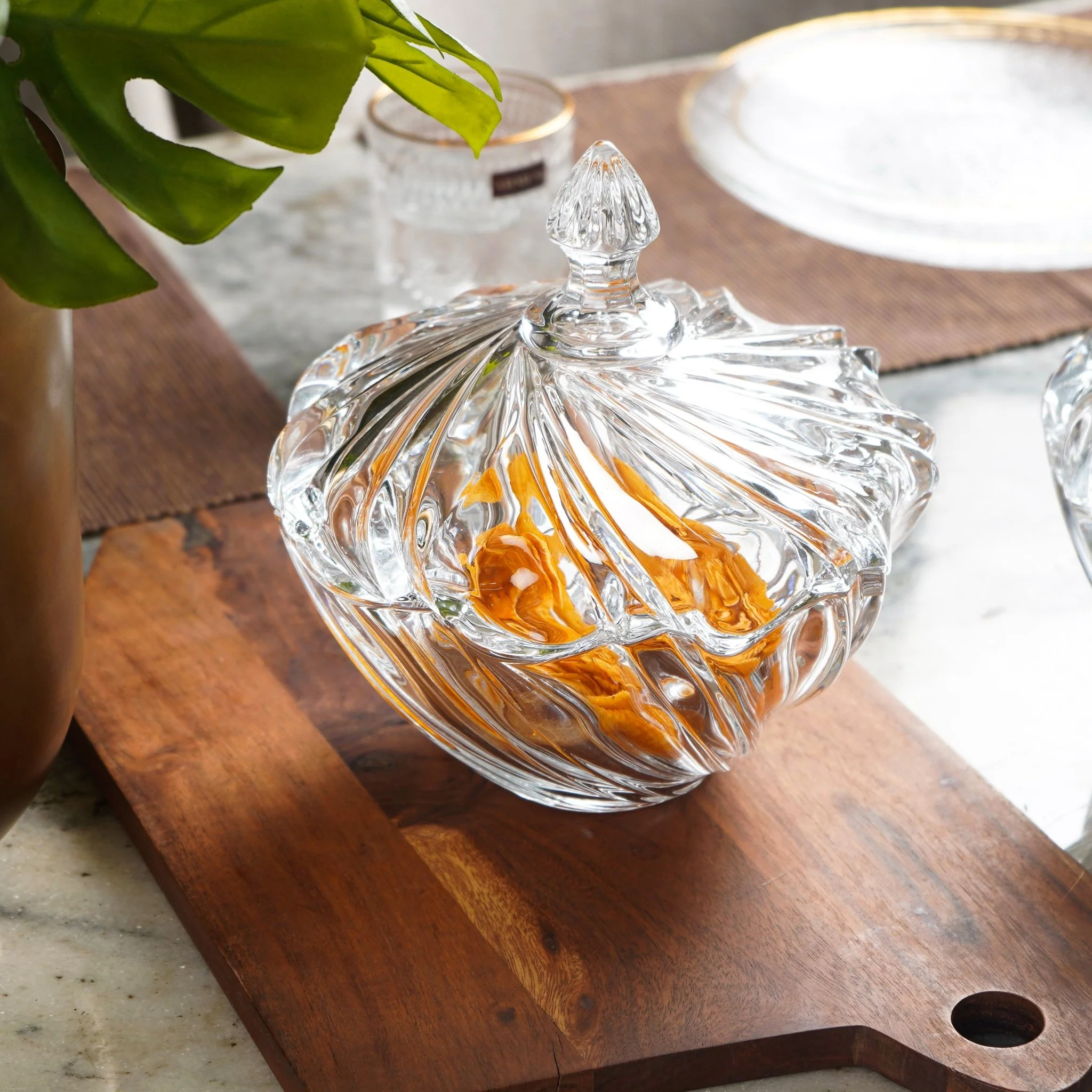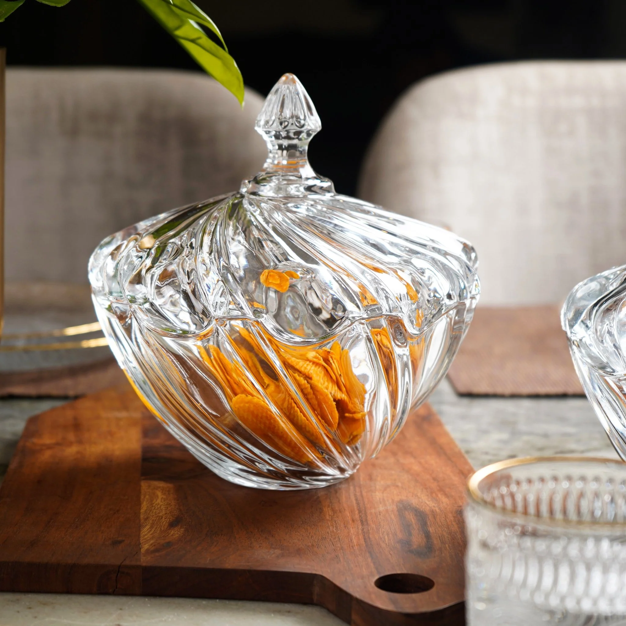 Indulge in the captivating allure of our 'SpiraEnchanté Glass Storage Bowl', where artistic beauty meets practical design.