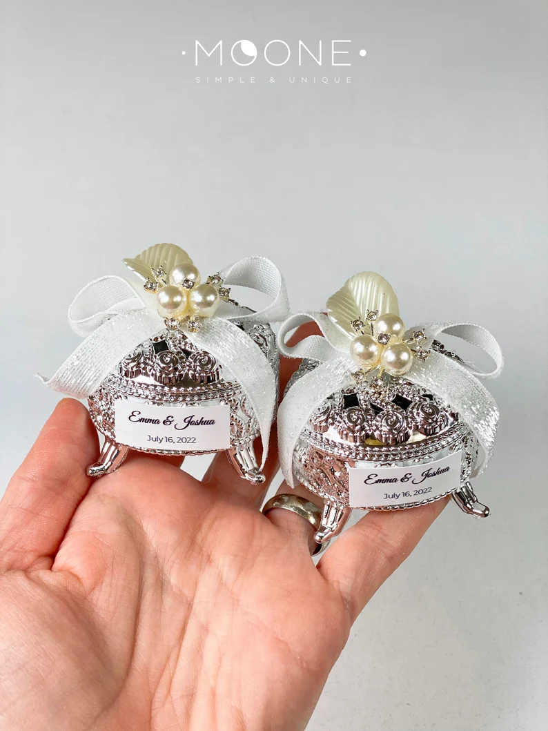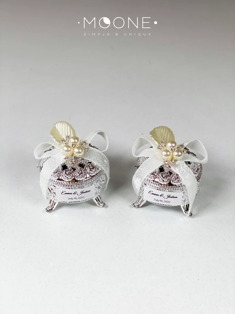 These beautiful personalized favor boxes are a perfect choice whether you're celebrating a wedding, engagement, birthday, bridal shower or a sweet 16 party! This silver or gold trinket favor box is a unique way to thank guests. You can put inside candies, cookies or your other favorite goodies.